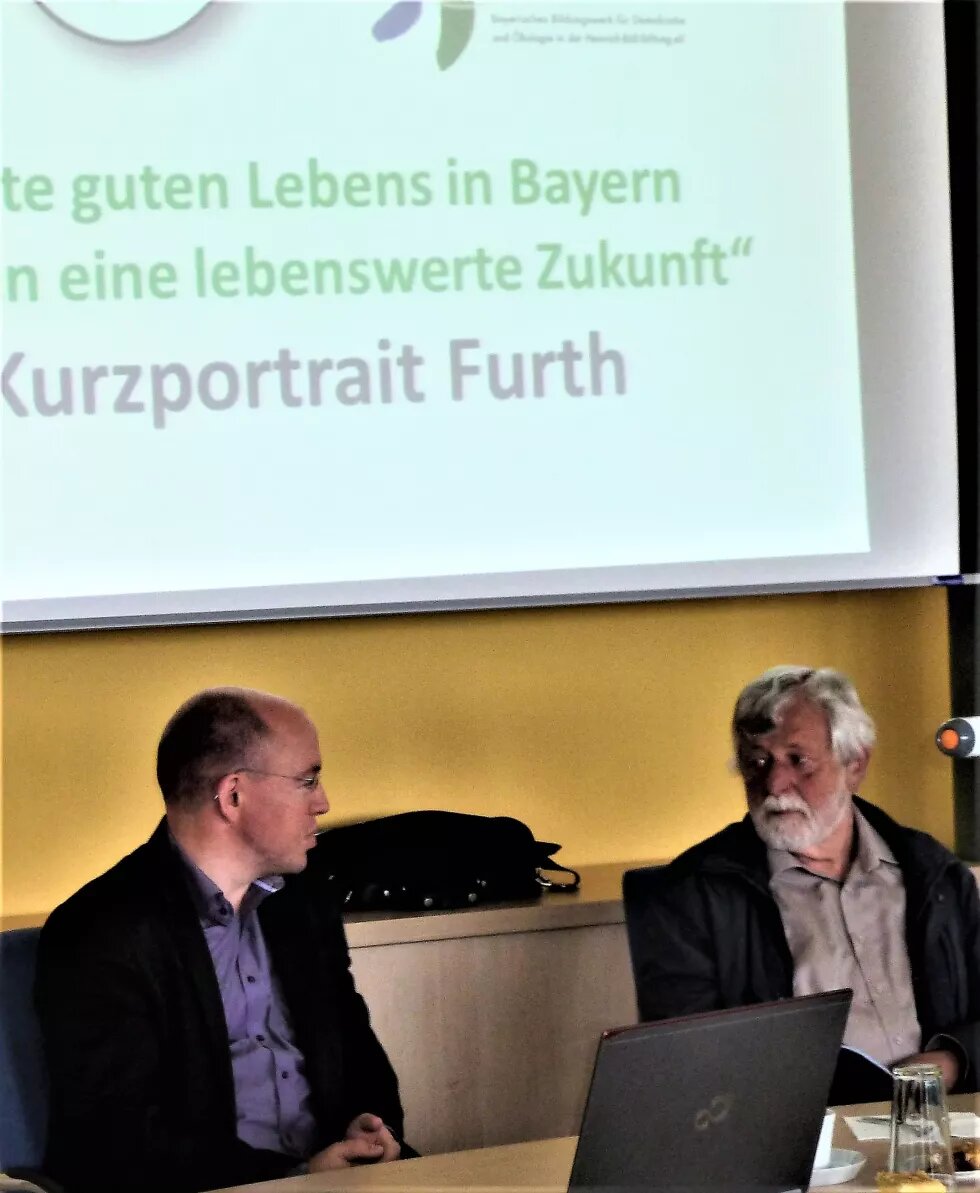 Dieter Gewies, der bis 2014 18 Jahre lang Erster Bürgermeister der Gemeinde Furth (ca. 3.500 Einwohner*innen) im Landkreis Landshut war, erläuterte die kontinuierliche, sehr pragmatisch orientierte Politik, die ihm und dem Dorf 2014 den Deutschen Nachhaltigkeitspreis eingebrachte. Das langjährig entwickelte Further Nachhaltigkeitskonzept ist in acht integrierte Nachhaltigkeitsfelder aufgeteilt und stellt die zentrale Richtschnur für alle Entscheidungen dar. Der Haushalt der Gemeinde wird durchgängig nach Nachhaltigkeitskriterien aufgestellt, verabschiedet und abgearbeitet. Umwelt- und sozialgerechte Beschaffung ist Grundlage für das Beschaffungswesen. 2011 wurde Furth mit dem Gütesiegel „Nachhaltige Bürgerkommune Bayern“ ausgezeichnet. Die starke Partizipation der Bürgerinnen und Bürger ist Teil einer bewusst angelegten Mitmach- und Anerkennungskultur. Sie ist Grundlage der Fortschritte im Nachhaltigkeitsbereich sowie bei notwendigen Investitionen z.B. im Bereich Energiewende und Innenentwicklung.