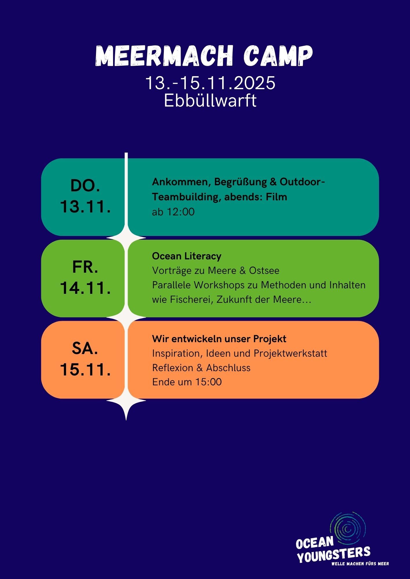 Das Camp dauert drei Tage inkl. Übernachtung. Die kostenfreien Camps finden vom 13. – 15. November 2025, 19. – 21. März und 07. – 09. Mai 2026 im Gäste- und Seminarhaus Ebbüllwarft an der Nordsee statt. Schulen können sich noch anmelden unter kontakt@ocean-youngsters.de.